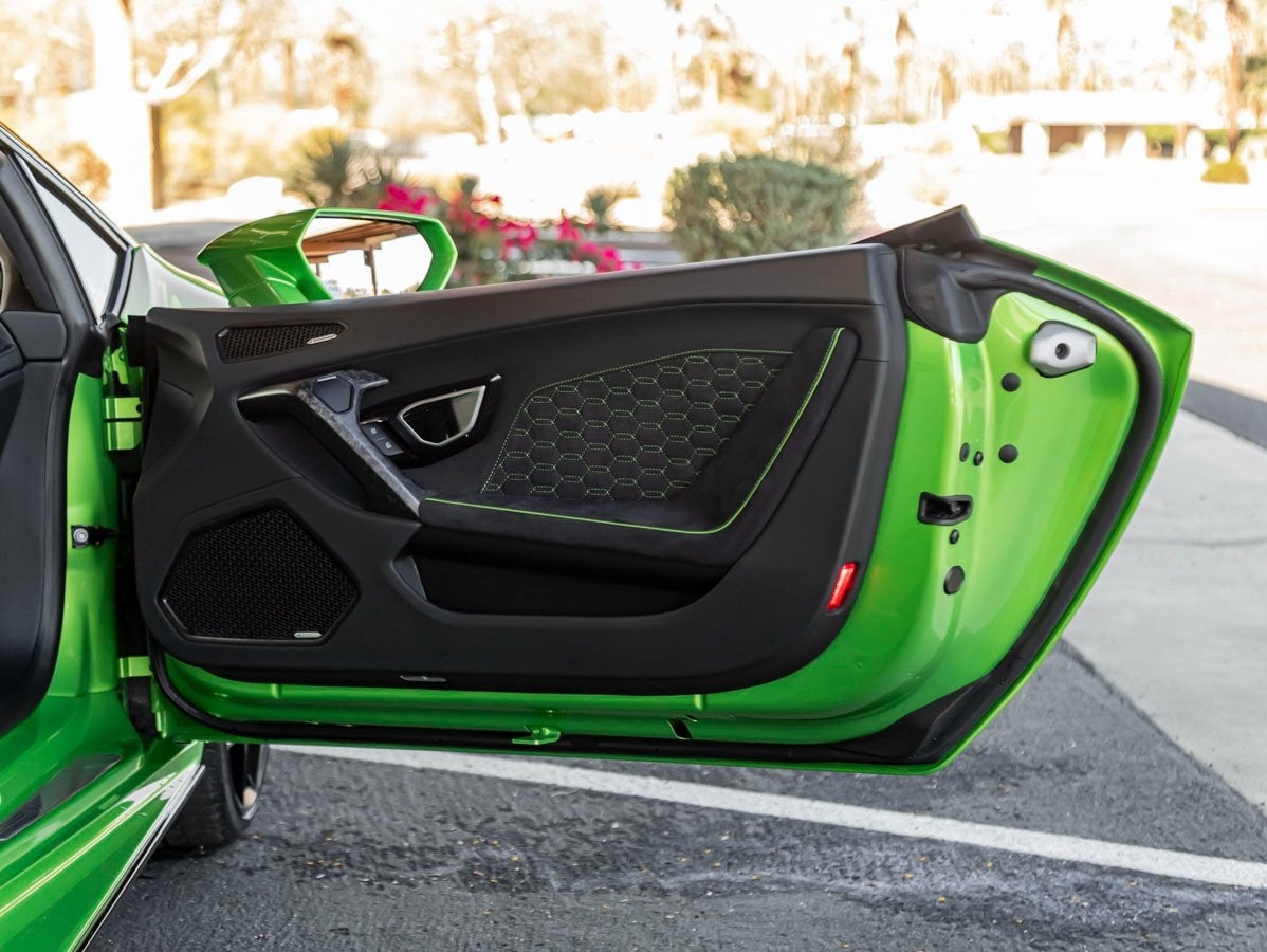Equipped with Carbon Ceramic Brakes with Green Calipers, this Huracan not only delivers extraordinary stopping power but also showcases its performance pedigree with unmistakable visual flair. The Style Package High and Windscreen Frame in High further elevate the exteriors dynamic presence, while Small Forged Composites highlight Lamborghinis commitment to lightweight innovation and cutting-edge materials.