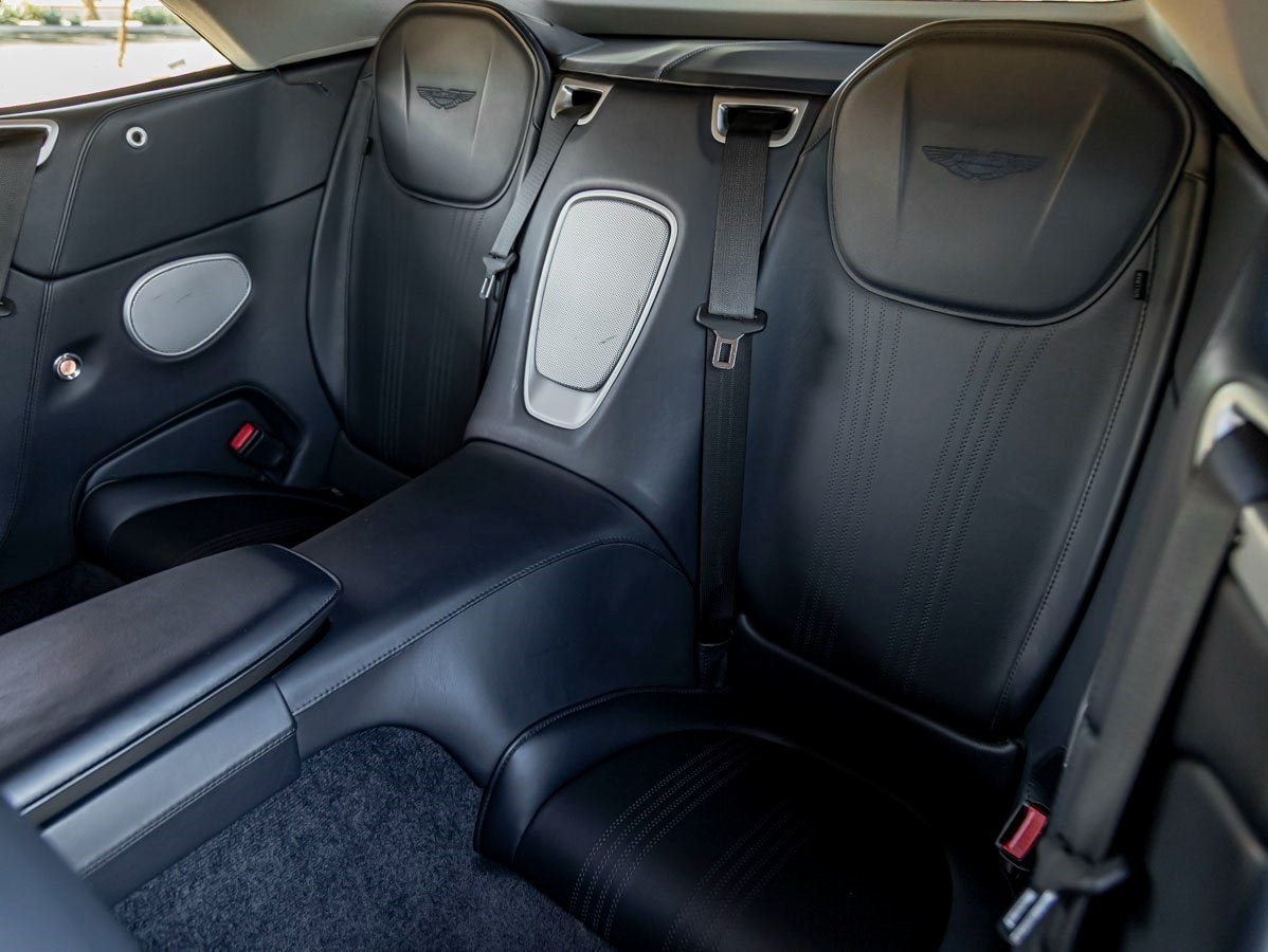 The DB11 V8 Volante exudes elegance and athleticism from every angle. Its sculpted lines flow seamlessly under the shimmering Hammerhead Silver finisha contemporary color that perfectly accentuates its aerodynamic silhouette. The visual drama continues with Yellow Brake Calipers and Smoked Rear Lamps, adding a distinctive and dynamic contrast. This examples Contemporary Paint specification enhances its exclusivity, while subtle details showcase Aston Martins dedication to design perfection.