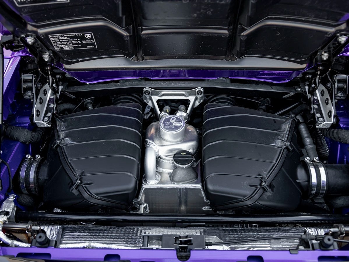 The Huracan EVO Spyder showcases Lamborghinis signature aerodynamic design and sculpted excellence. 20 Forged Shiny Black Navi Rims provide a powerful and elegant contrast to the deep Viola Pasifae paint, while the black brake calipers and Style Package Full Specs enhance its dramatic character. The Windscreen Frame and High Gloss Pack further elevate its refined and commanding presence.
