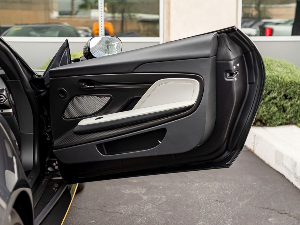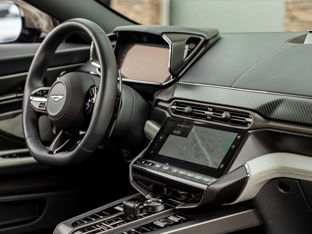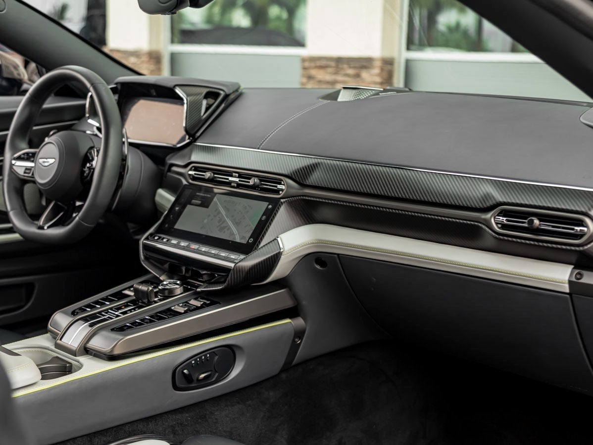 Inside, the cabin is a showcase of bespoke luxury and driver-focused design. The Titanium Grey Semi-Aniline leather interior is elevated by the Duotone Inspire Interior and AMR Line detailing, creating a refined yet purposeful environment. Extensive use of 2x2 Twill carbon fiber throughout the upper and lower cabin adds a modern, motorsport-inspired edge, while lightweight seats and heavy pile floor mats balance performance with comfort. Every surface reflects Aston Martins uncompromising attention to detail and craftsmanship.