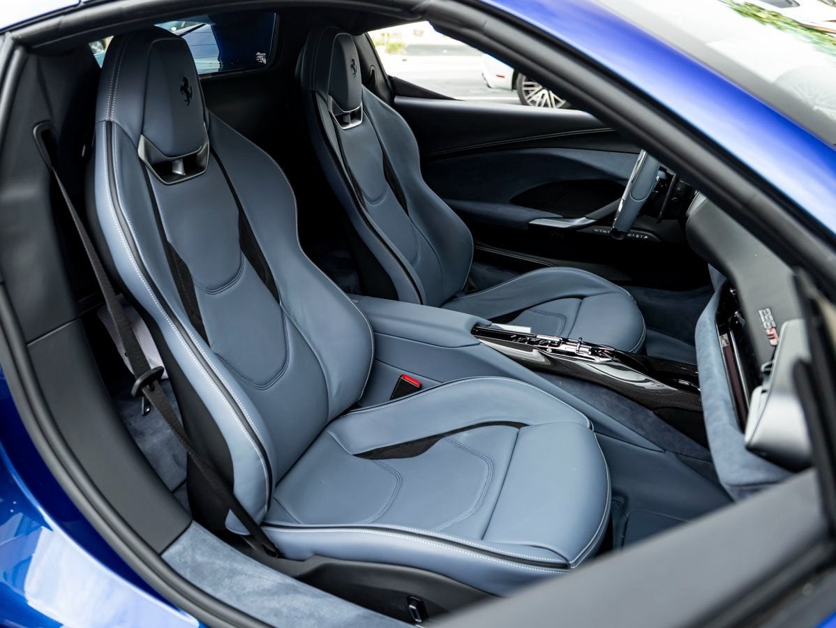 The Ferrari 296 GTS commands attention with its sculpted proportions, aerodynamic precision, and unmistakable mid-engine stance. The Blu Corsa finish accentuates every curve and contour, while performance-focused details such as Blue Brake Calipers, Black Ceramic Exhaust Pipes, and the iconic Scuderia Ferrari Shields proudly displayed on the front fenders reinforce its racing DNA. Additional carbon fiber elements, including the exterior carbon fiber sill kicks, add lightweight sophistication, while subtle touches like the long and thin Italian flag celebrate Ferraris storied heritage.